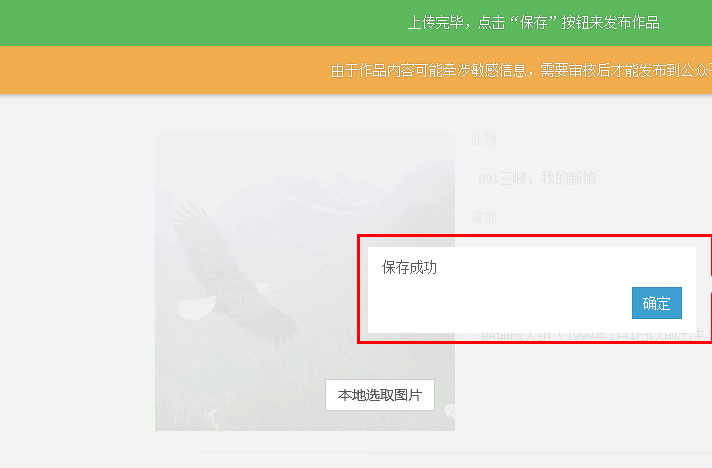 4.选中 要上传的参赛作品,在 上传作品页面 点击左侧的图片 可以 上传头像(请用类似于一寸照片或者二寸照片大小的头像!可以用QQ截图截取头像;头像文件大小最好不超过100k;文件太大会导致无法上传头像 ),在右侧填写参赛选手的姓名、电话、身份证号并选择参赛组别 后,点 “保存”。