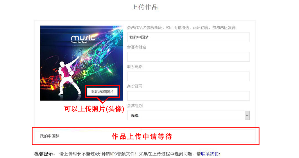 上传作品时请注明:作品名称-姓名-参赛阶段;如:春-张三-海选、假如-李四-初赛、散步-王五-复赛、我想-赵六-赛区半决赛、雨后-郑七-赛区决赛。